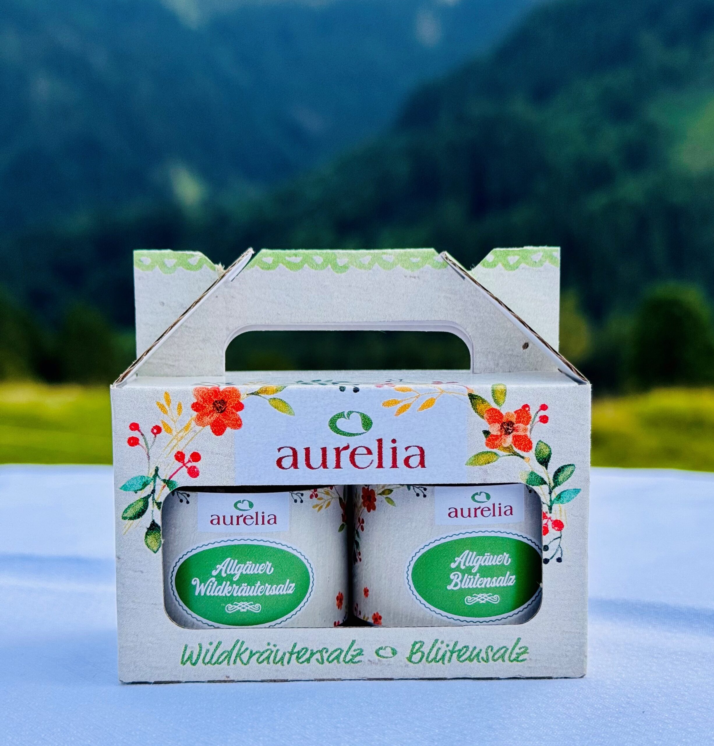 Allgäuer Wildkräutersalz: (Steinkristallsalz, Petersilie gerebelt, Schnittlauch getrocknet, Liebstöckel gerebelt, Estragon gerebelt, Bärlauch geschnitten, Kerbel, Bohnenkraut, Schabzigerklee, Schafgarbe, Brennnessel, Oregano, Kornblume, Ringelblume, Rosenblüten, Holunderblüten)